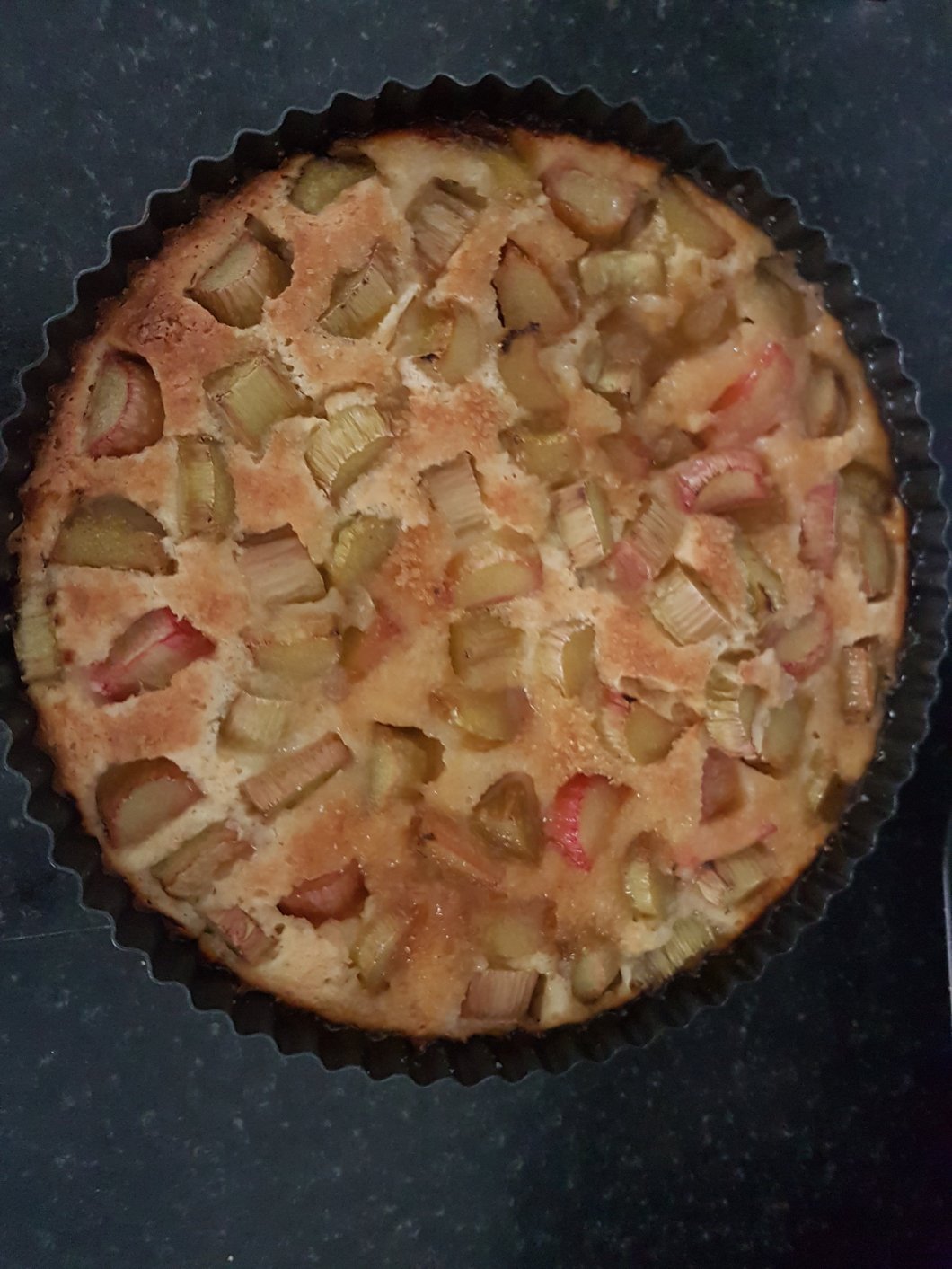 - Spoon the sugary rhubarb onto the cake mix, and top with any remaining sugar.