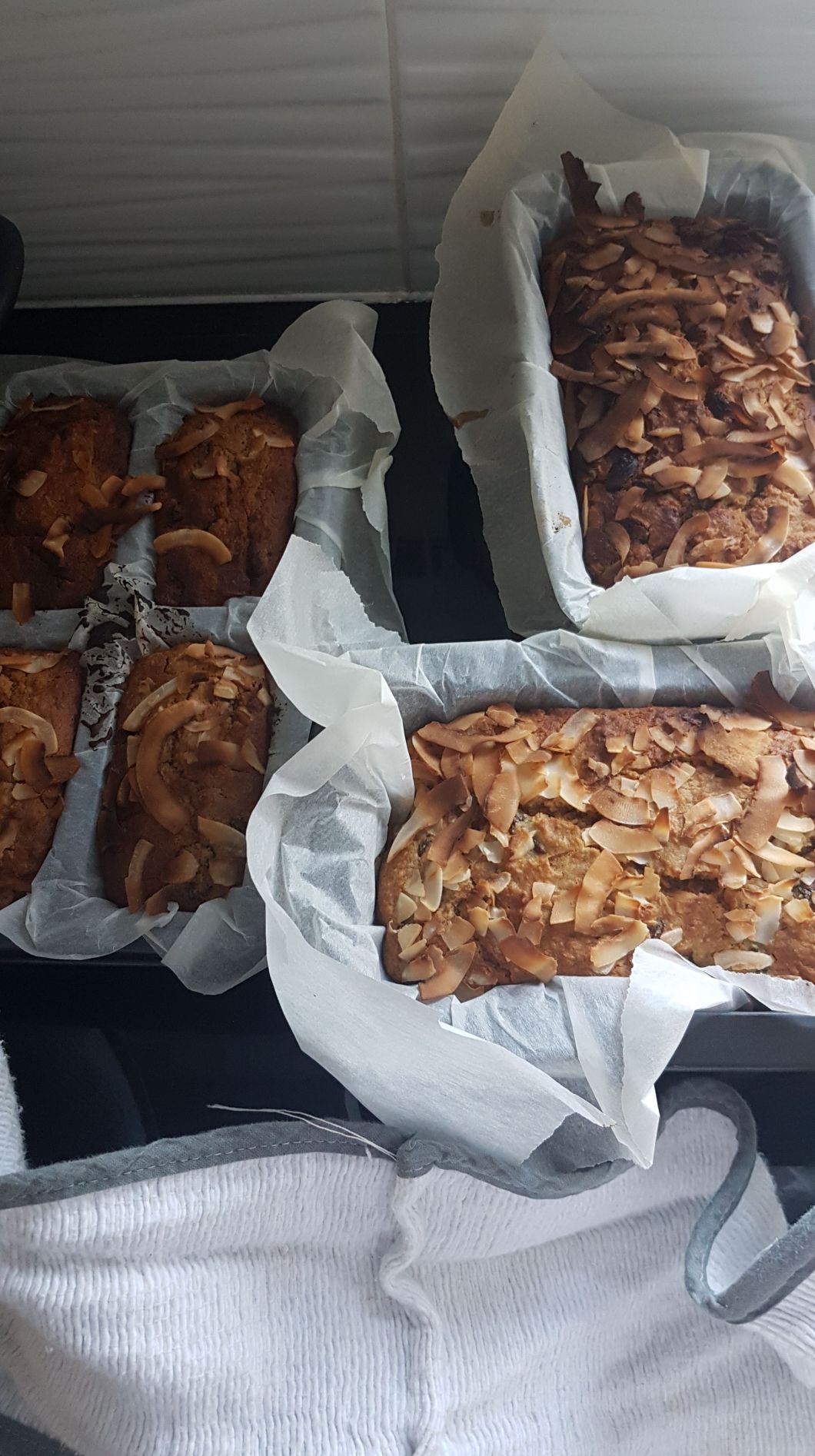 - Divide the mixture into the baking tins and sprinkle with coconut flakes.