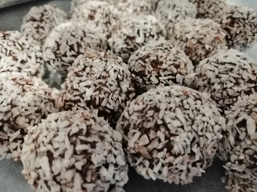 - Roll the ‘dough’ into small balls and roll into dessicated coconut or pearl sugar.